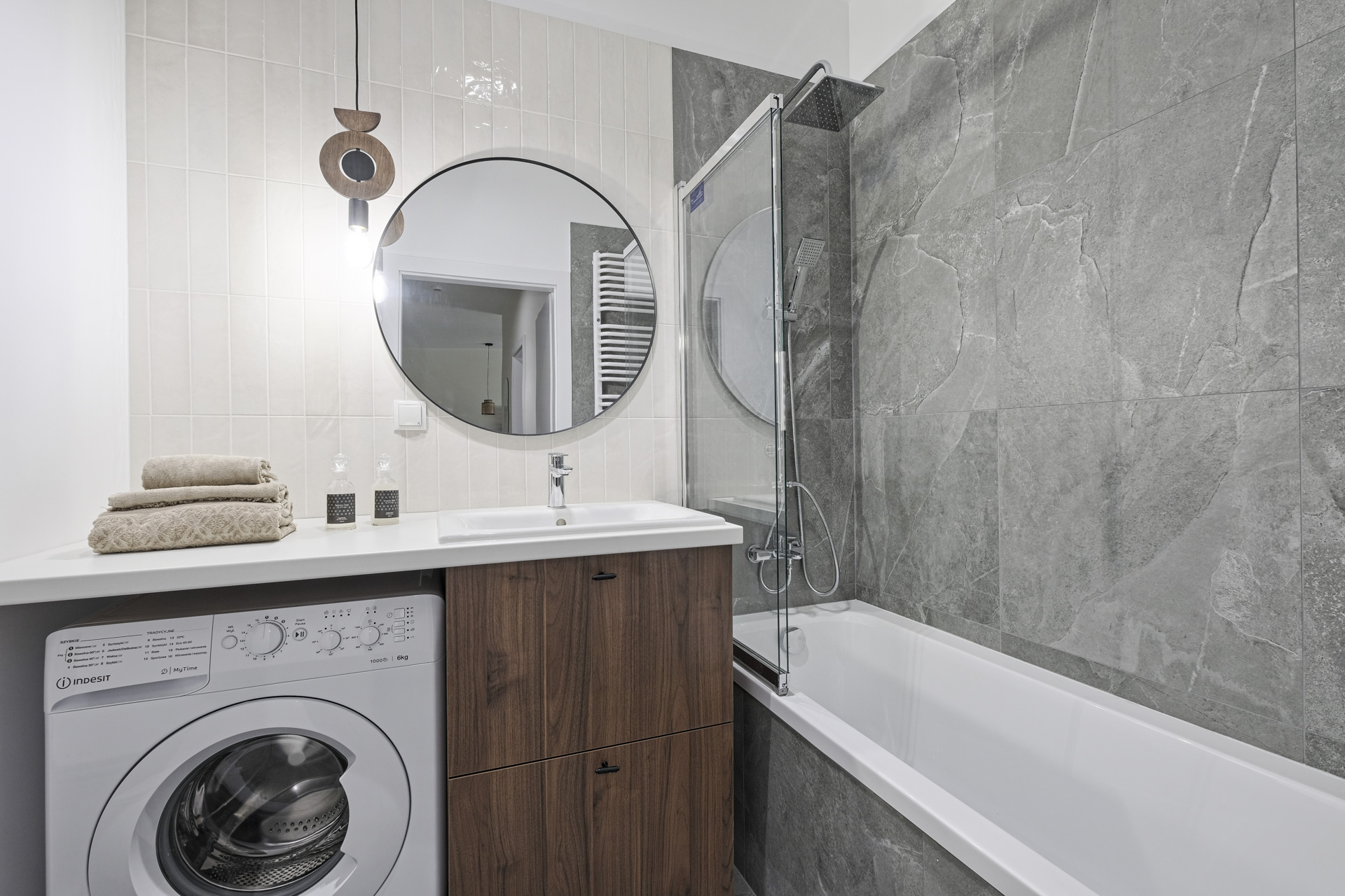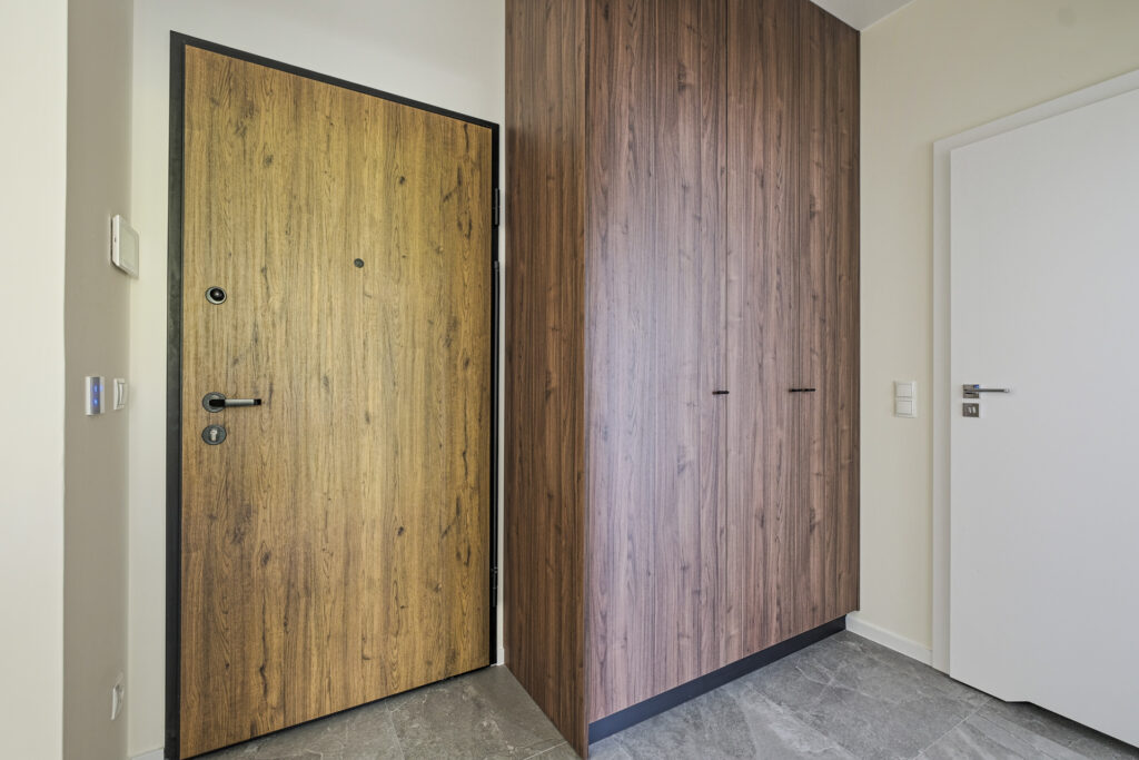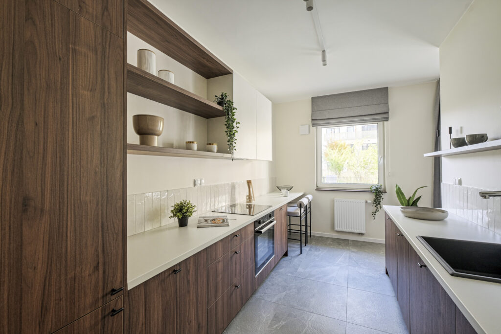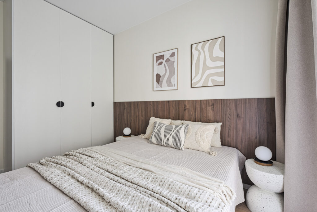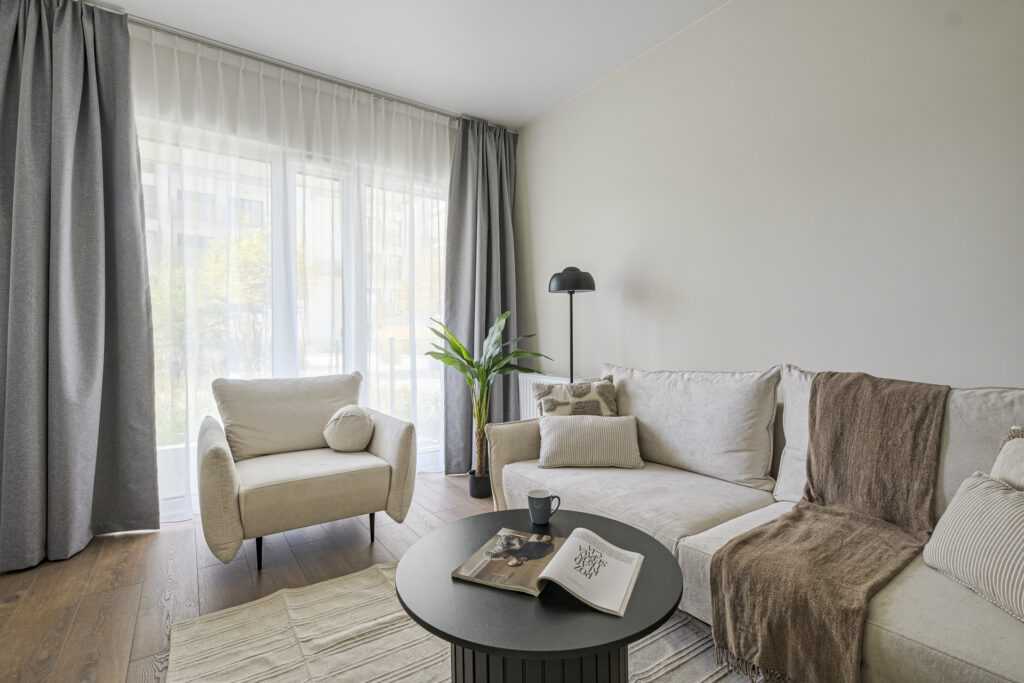 The flat was realised in the Modern Organic finishing package. It is a spacious flat located on the ground floor of a new building, with a separate bedroom, a large living room separated by a half-wall from a comfortable, bright kitchen. There is a bathtub and washing machine in the modern bathroom, and a large wardrobe in the hall. The flat, like others in the development, has large windows with a nice view of the greenery and ponds and a spacious terrace overlooking the green areas of the City Flow development.