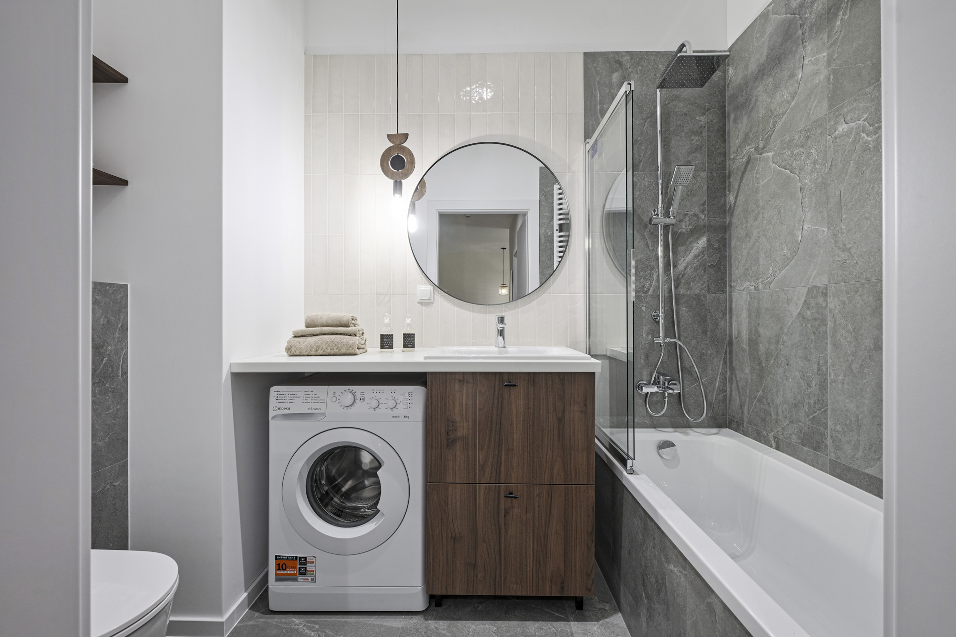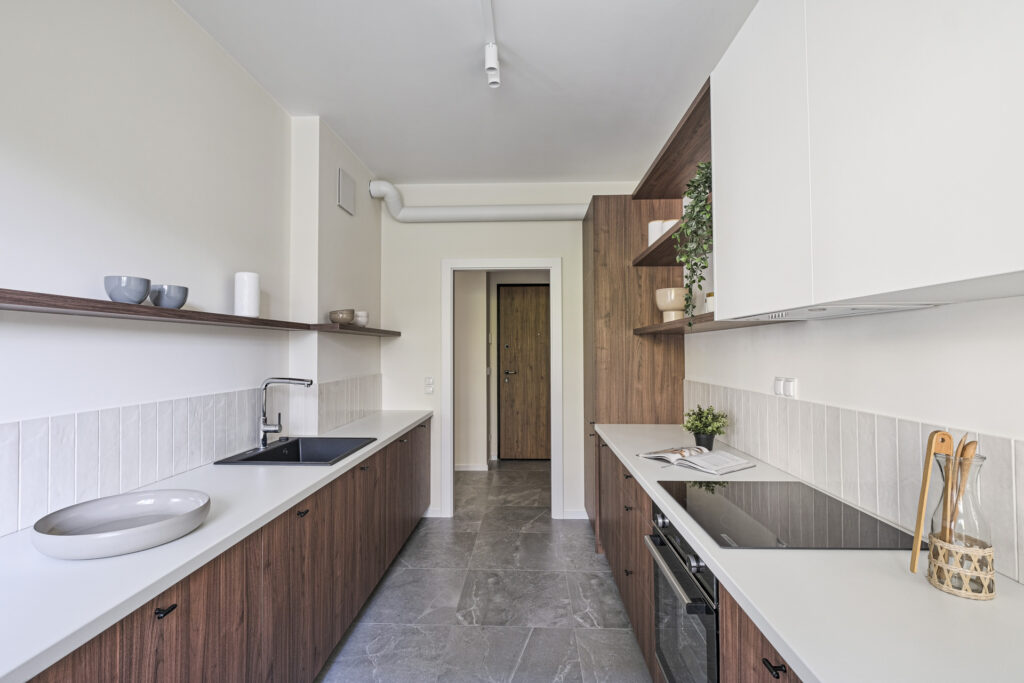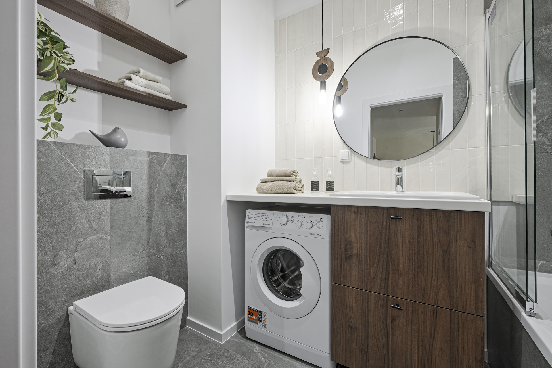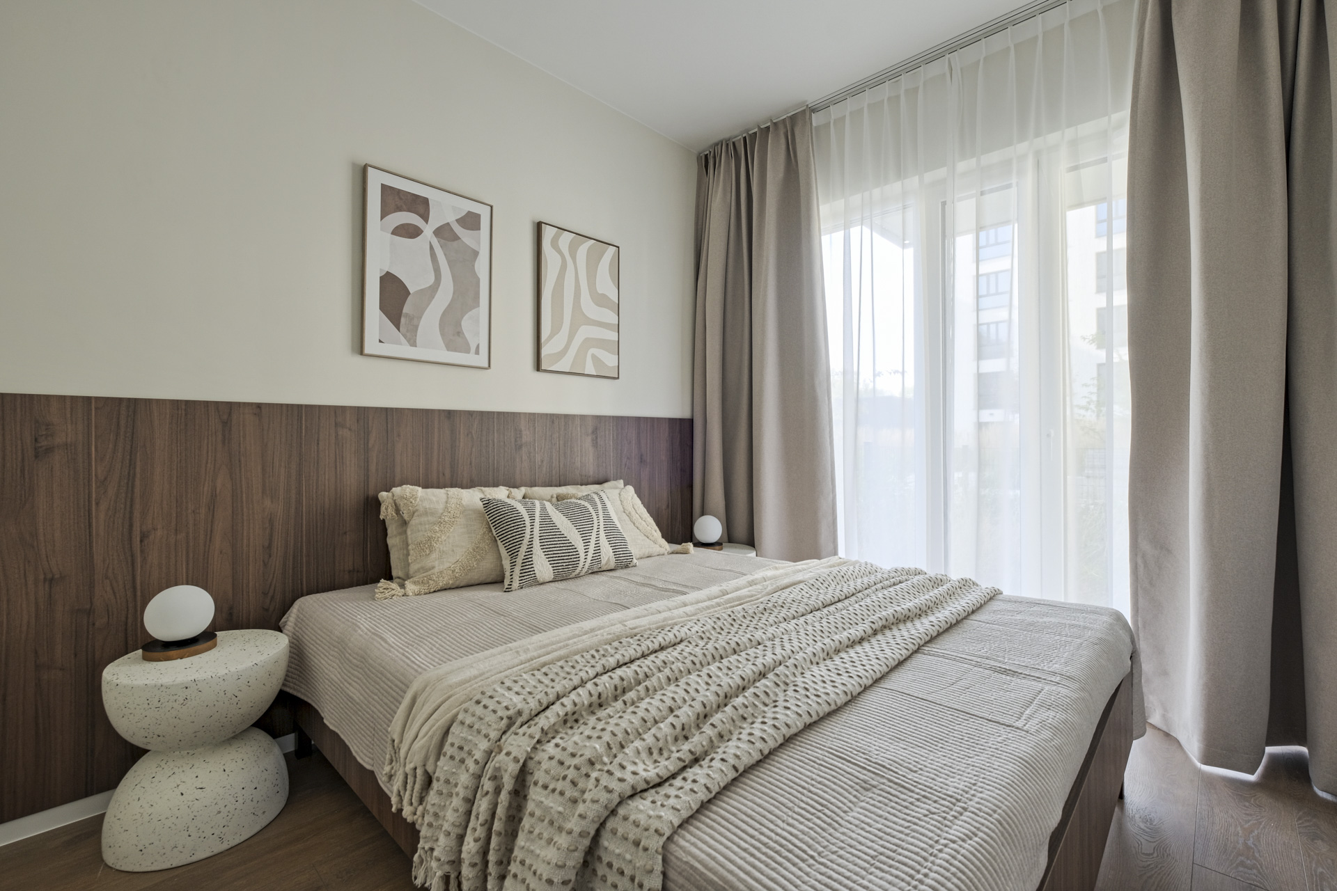 The flat was realised in the Modern Organic finishing package. It is a spacious flat located on the ground floor of a new building, with a separate bedroom, a large living room separated by a half-wall from a comfortable, bright kitchen. There is a bathtub and washing machine in the modern bathroom, and a large wardrobe in the hall. The flat, like others in the development, has large windows with a nice view of the greenery and ponds and a spacious terrace overlooking the green areas of the City Flow development.